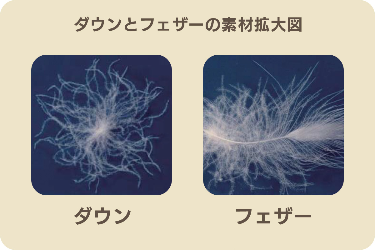 ダウンとフェザーどちらも布団やジャケットでよく目にするけれど、どちらも羽毛の一種で、一般的にダウンの比率が高いほど温かく柔らかいと言われているよ。
