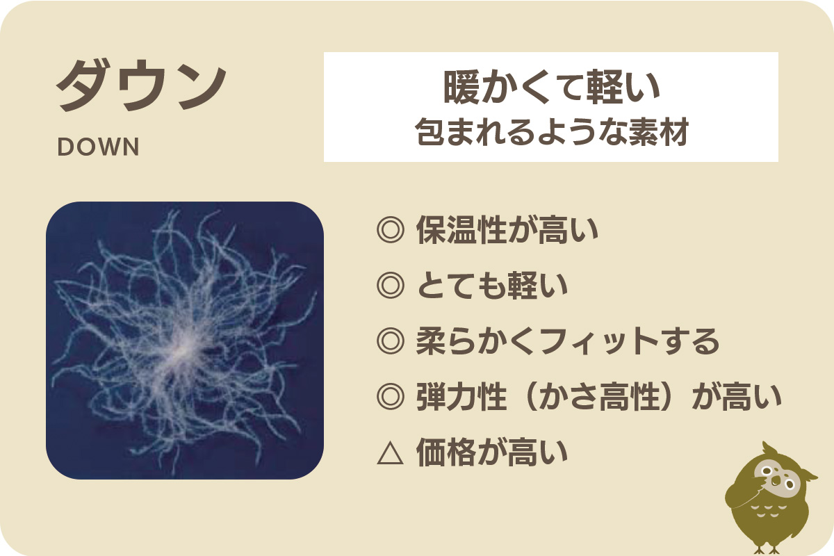 また、ダウンは非常に弾力性があり、使ったときの感触も柔らかく快適です。寒い冬を暖かく過ごしたい場合には最適な素材といえます。