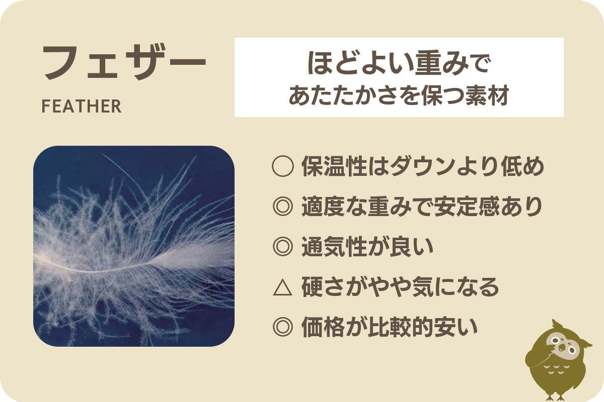 また、形を保つ力が強いので、枕やクッションなど、形状を維持する必要があるアイテムに適しています。しっかりとした支えが欲しい場合には、フェザー素材が向いているでしょう。